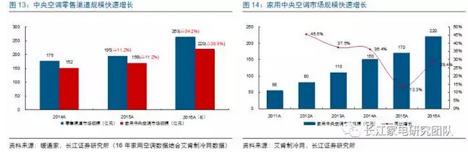 多聯(lián)機(jī)市場(chǎng)得以逐漸擺脫地產(chǎn)束縛實(shí)現(xiàn)高速增長的核心主因在于其零售渠道方面的良好表現(xiàn),而帶動(dòng)零售渠道需求釋放的主因一方面在于供給端中央空調(diào)廠商持續(xù)的終端零售渠道建設(shè)投入,另一方面也是最重要的,我們認(rèn)為是需求端家用中央空調(diào)消費(fèi)的逐步崛起;目前家用中央空調(diào)總體市場(chǎng)規(guī);蛞殉^中央空調(diào)市場(chǎng)總?cè)萘康娜种,且市?chǎng)仍舊持續(xù)超過兩位數(shù)的高速增長,隨著高增長的家用部分在中央空調(diào)市場(chǎng)整體份額中權(quán)重不斷提升,其有望驅(qū)動(dòng)中央空調(diào)行業(yè)重歸正成長。