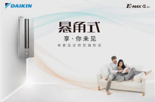 全新E-MAX α系列懸角式空調(diào),革命性的懸角設計,可懸掛于客廳轉(zhuǎn)角,為客廳釋放出更多黃金空間。