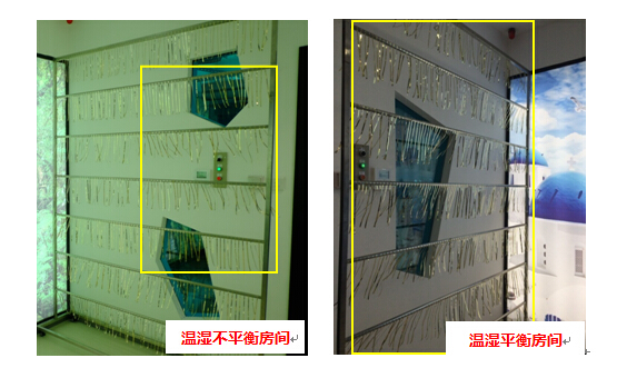 為了更好地檢測中央空調(diào)的出風和氣流,在正對空調(diào)出風口的對面拜訪了一個流蘇架,這樣就能很清楚地看出空調(diào)的風向和風速了。